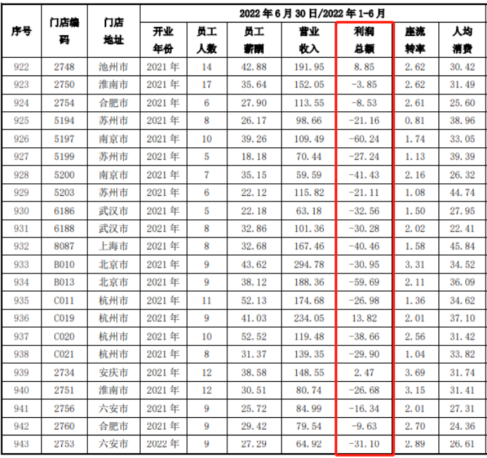 其二,新店尚未达到收支平衡点,而疫情反复也将进一步带来不利影响。招股书显示,一般情况下老乡鸡新店达到收支平衡所需的时间为9-18个月。如图,截至2022年6月底,2021年新开业的南京、武汉等安徽省外门店多数目前仍处于亏损状态。