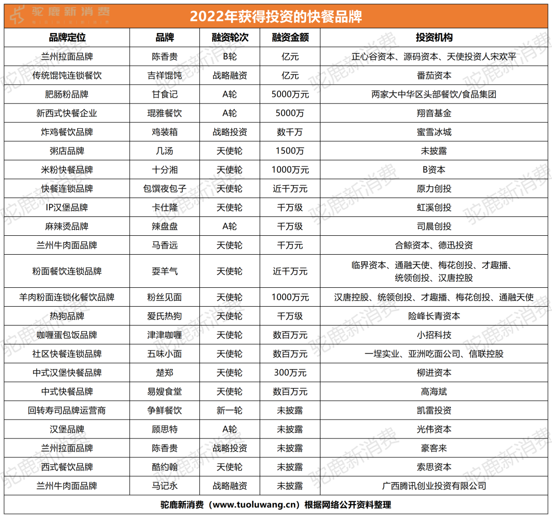 根据驼鹿新消费不完全统计,2022年共有22家快餐品牌获得融资,根据已披露融资金额的企业估算,总计获得超过4.37亿元的融资。