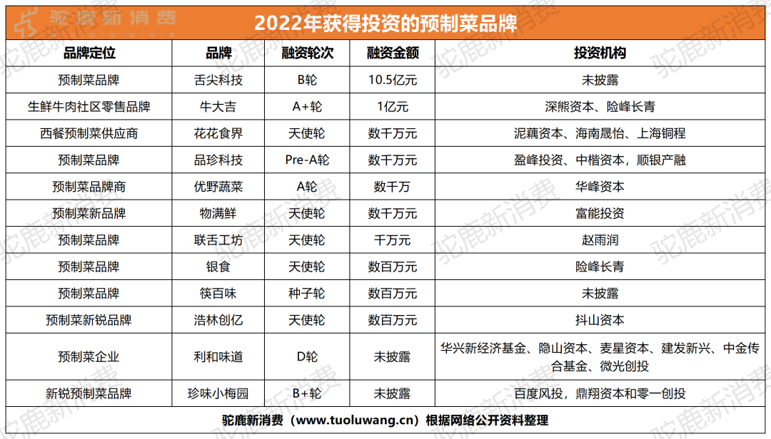 根据驼鹿新消费不完全统计,2022年共有12家预制菜品牌获得融资,根据已披露融资金额的企业估算,总计获得超过12.9亿元的融资。