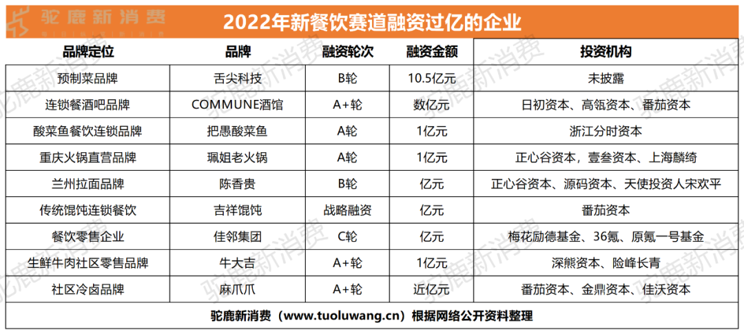 根据驼鹿新消费不完全统计,2022年共有9家餐饮企业获得过亿元融资,根据估算,共计获得超过20.5亿元融资,占到新餐饮赛道融资总额(33.19亿元)的62%。