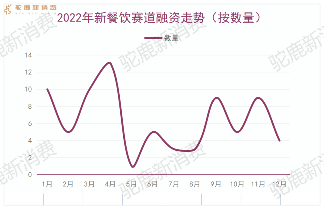 以月度为维度来看,按照融资数量比较,4月份是新餐饮赛道的融资高峰,单月有13家企业获得融资,5月份则为新餐饮赛道的融资低谷,单月仅有1家企业获得融资。平均每月约有6到7家左右的餐饮企业获得投资。
