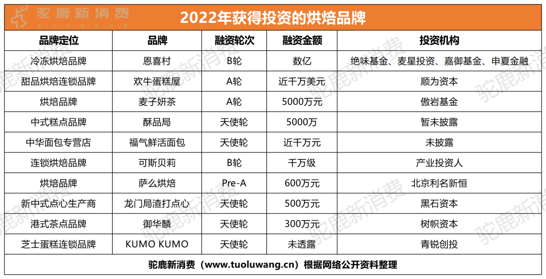 根据驼鹿新消费不完全统计,2022年共有10家烘焙品牌获得融资,根据已披露融资金额的企业估算,总计获得超过5.01亿元的融资。