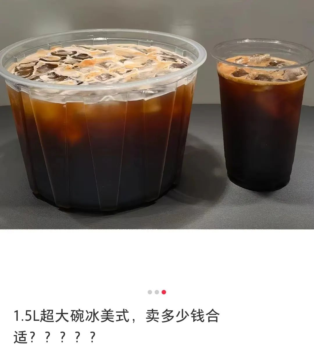 从常规的300ml到喝到饱的16oz,再到直接当水喝的1L装,有的门店甚至打算推出1500ml的“超大大大大冰美式”。总之,为了提高市场竞争力,这些商家主打的就是一个“就比你更big”的杯量升级路线。满满一大杯、一大桶,先从外观上就做到了十足吸睛的效果。