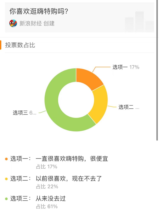 新浪科技的一份投票显示,嗨特购目前仍有一部分粘性较强的粉丝,但有五分之一的消费者表示,自己以前是嗨特购的顾客,但如今不再喜欢嗨特购了。这也说明着,嗨特购的生存比往年艰难。