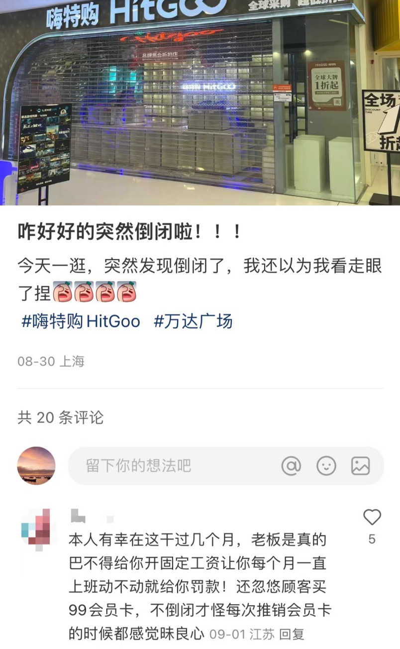 2021年才创立,仅仅两年的事件就已经出现了倒闭的门店。该门店前员工表示,店长要求店员向顾客极力推销年卡会员。“都叫嗨特购了,顾客还得开会员去减钱,公司太会了!”有不少网友都在吐槽,对自己为了而省钱去花钱的动作表示“无语”。