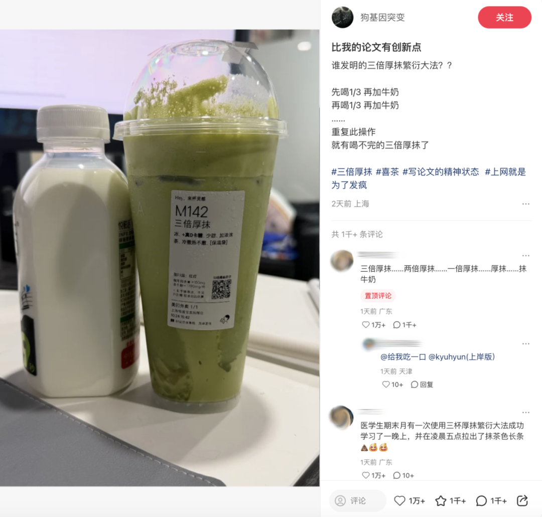 喝三倍厚抹的快乐之于抹茶脑袋,宛如舔奶盖的快乐之于酸奶信徒。于是,它成了各路抹茶bot的座上宾,隔三差五就被反复投稿,被封为“抹茶真神”“喜茶最伟大的发明”,“三倍厚抹天下第一”的复读声此起彼伏。