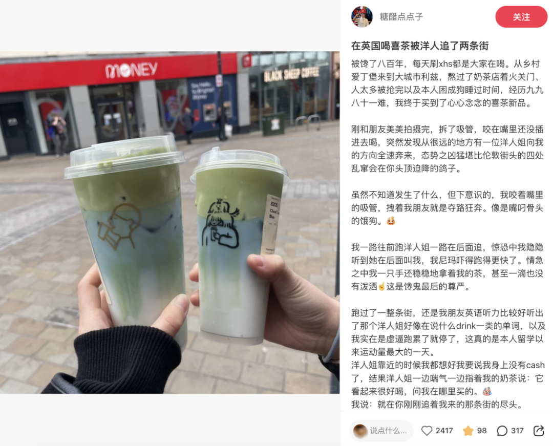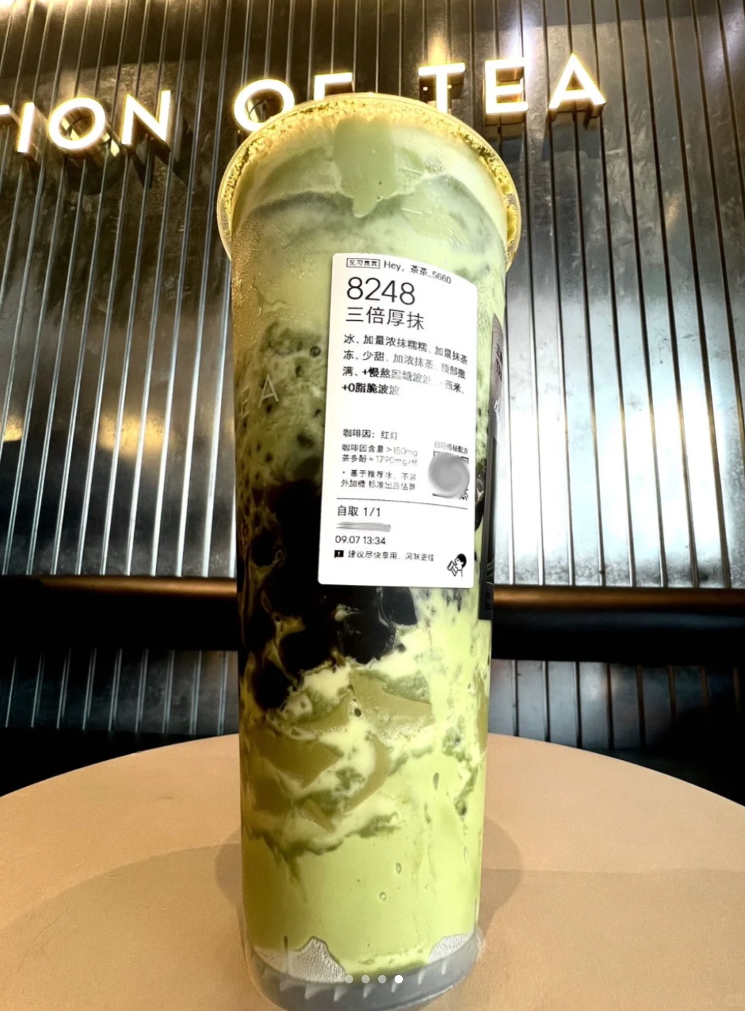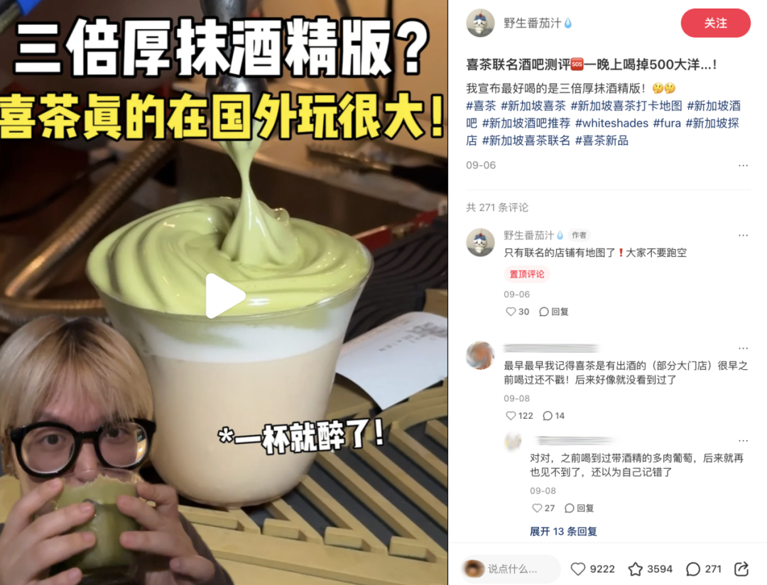 跟着抹茶city walk,你可以喝到三倍厚抹酒精版,“怎么没人告诉我喜茶在国外玩这么大” 。