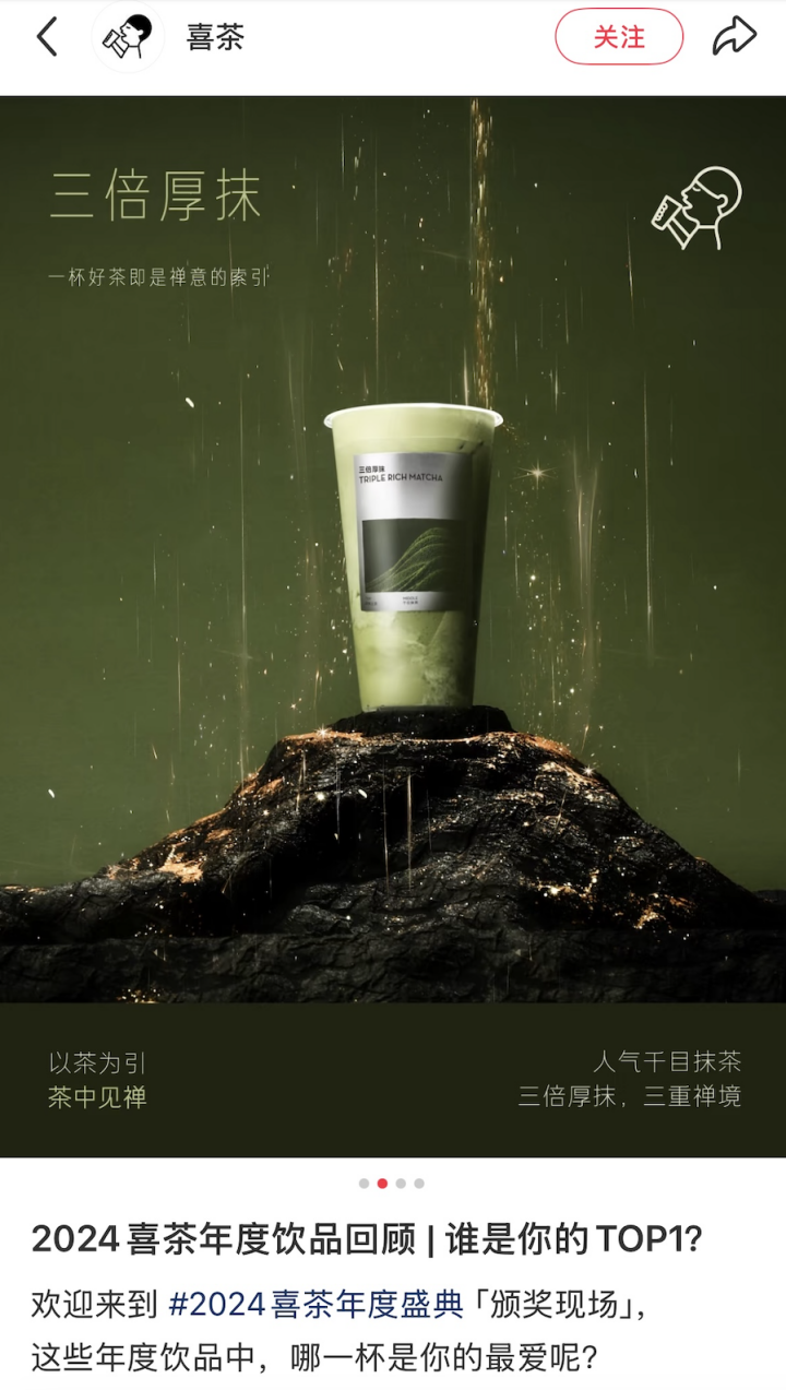 在三倍厚抹诞生之前,抹茶就一直是喜茶的灵魂产品之一。从最初的经典款「芝芝抹茶」开始,它几乎年年都在拓宽「抹茶宇宙」的边界,比如2022年和联名电视剧《梦华录》推出的“梦华茶喜·点茶”,甚至还请来了身着汉服的茶艺师当场点茶,手绘睡莲图,禅意十足。