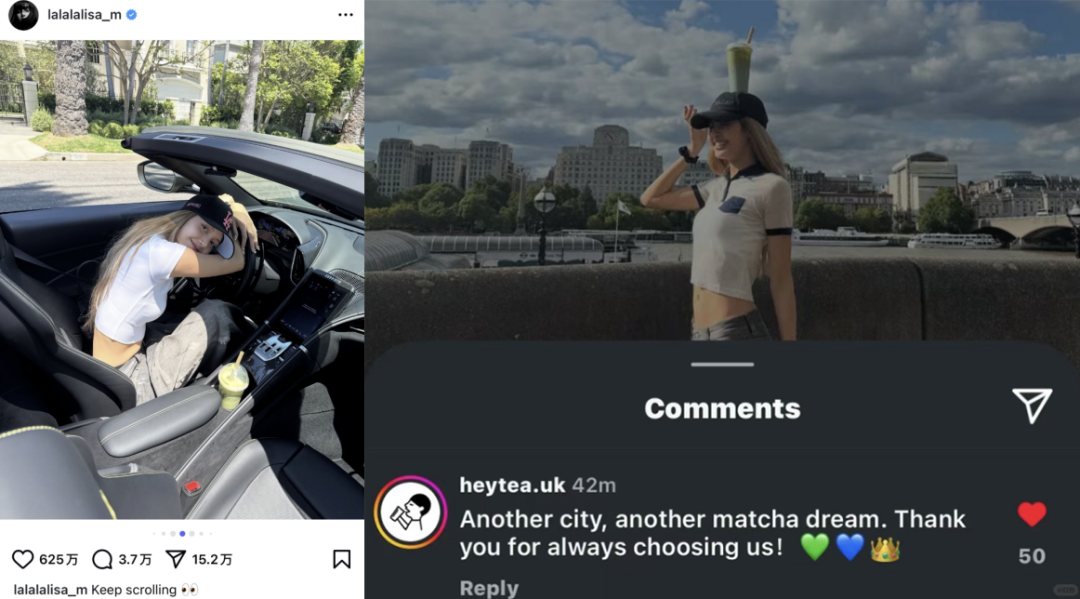 亚太带货女王Lisa先是在法拉利上和三倍厚抹亲切合影,一举把“喜茶抹茶全球爆单”送上热搜;没过几天又头顶“抹云椰蓝”,上亿粉丝的社交账号就这样把C位留给抹茶,带动抹茶销量进一步激增,喜茶全球多地门店出现排队、售罄现象。
