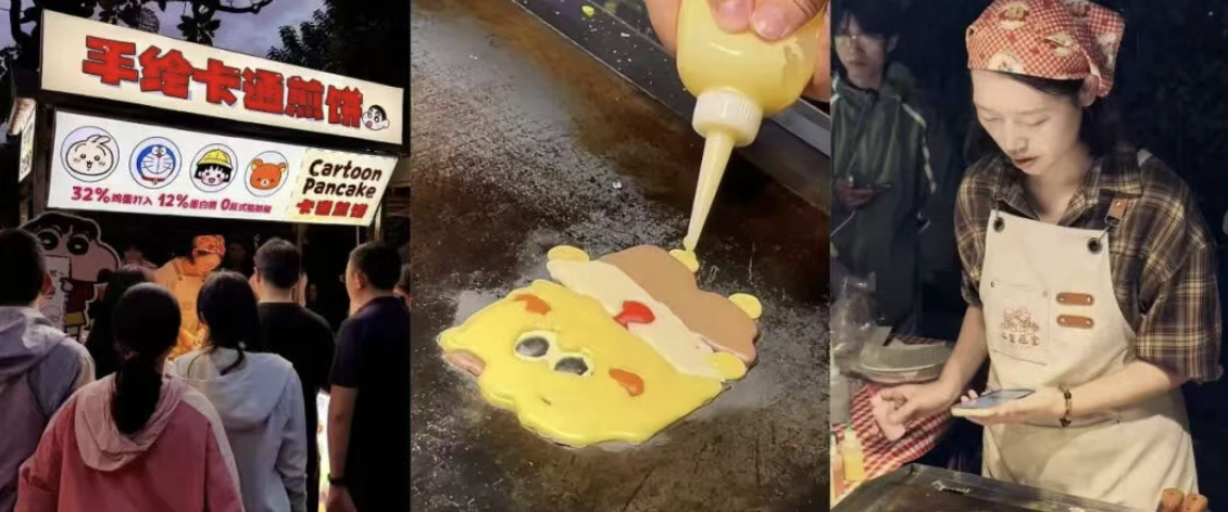 海绵宝宝、玲娜贝儿、Labubu等可爱的卡通煎饼出现在成都抚琴的夜市上,这个普通的煎饼摊前被年轻人围得水泄不通,成了“网红打卡地”。