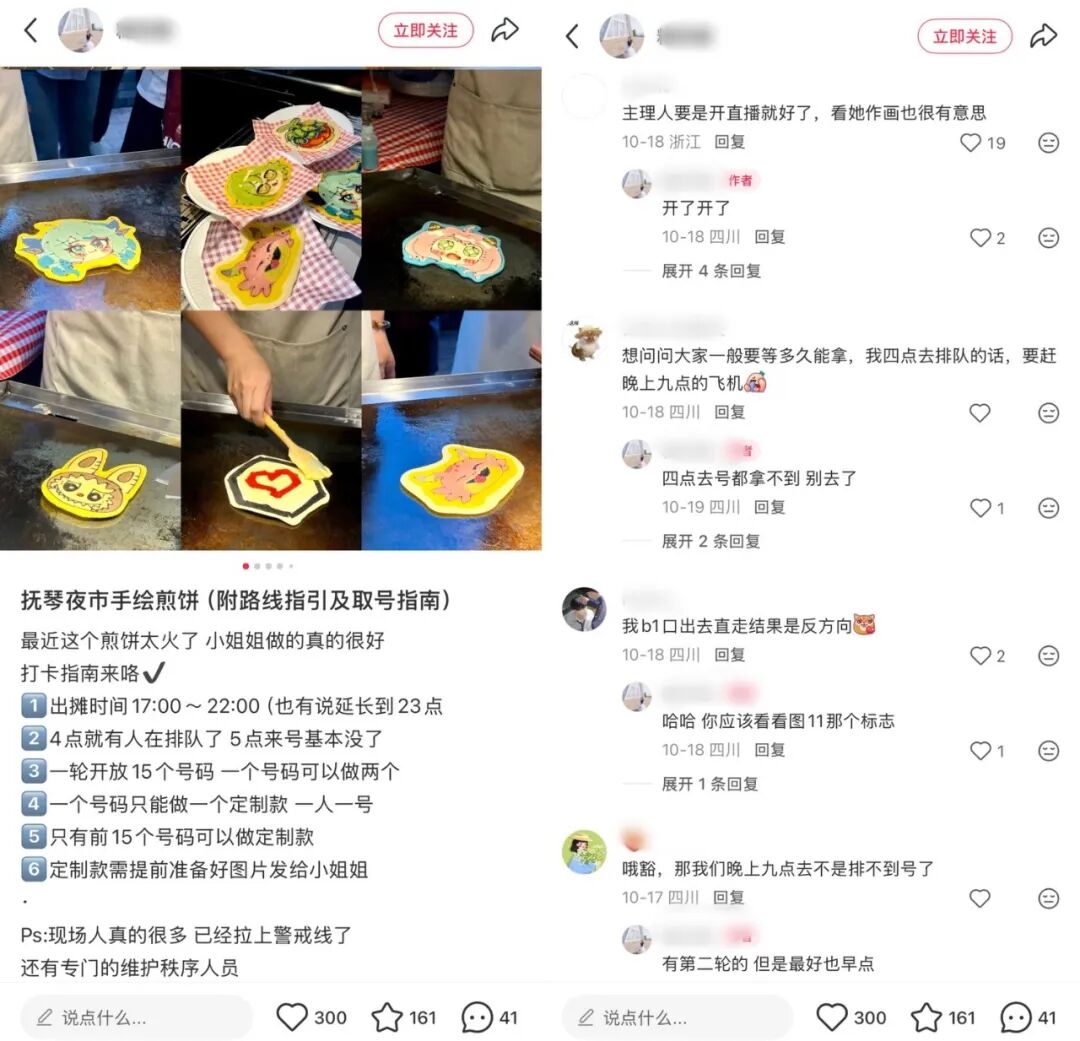 一份独一无二的卡通煎饼,在被年轻人们分享展示在社交平台上,收获了点赞评论和认可,同时分享也进一步扩大了传播范围,吸引了越来越多的人来购买。