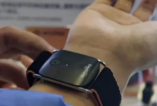 据现场工作人员介绍,这款电子咖啡手环是通过“精准电脉冲刺激达到提神醒脑的效果”,手环背面有两片电极片,使用时会发出温和的电脉冲,当用户犯困时,双击按键,手环背后的电极片就会刺激手腕神经,电刺激能扩张血管,给大脑多输送血液和氧气,提升专注力和反应力,模拟出喝咖啡的提神效果。