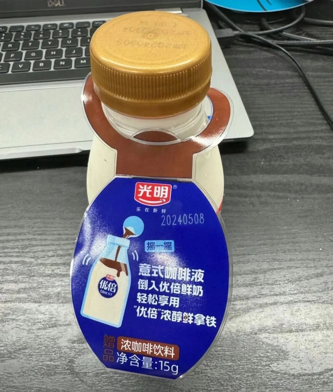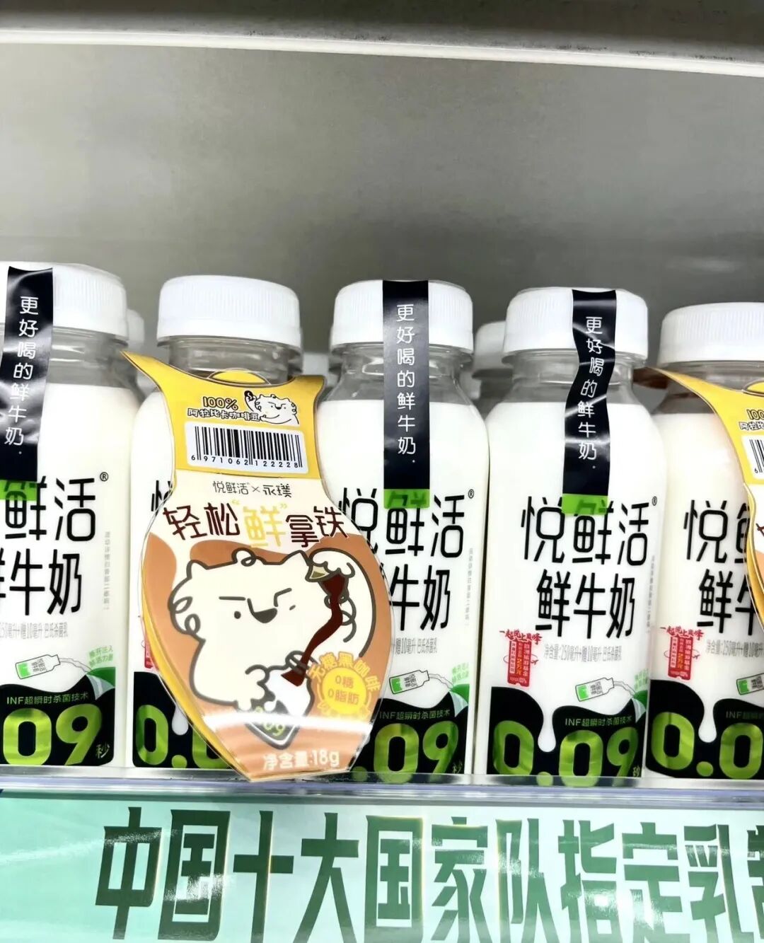 一瓶鲜奶瓶口上套着一个浓缩咖啡液,标签上还写着“轻松get鲜拿铁”。