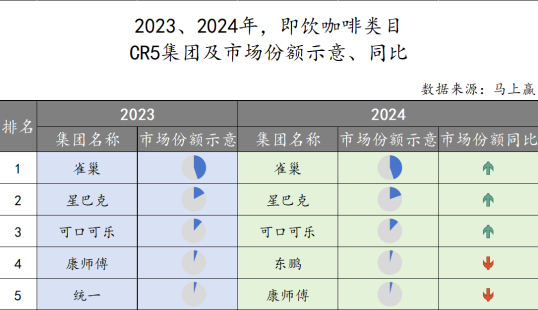 基于马上赢品牌CT数据显示,2023年到2024年,即饮咖啡CR5品牌的市场份额从84.32%上升到85.35%,雀巢稳居第一,东鹏后来者居上进入品牌前五。可见即饮咖啡品类类目的集中度较高,类目整体存在固化。