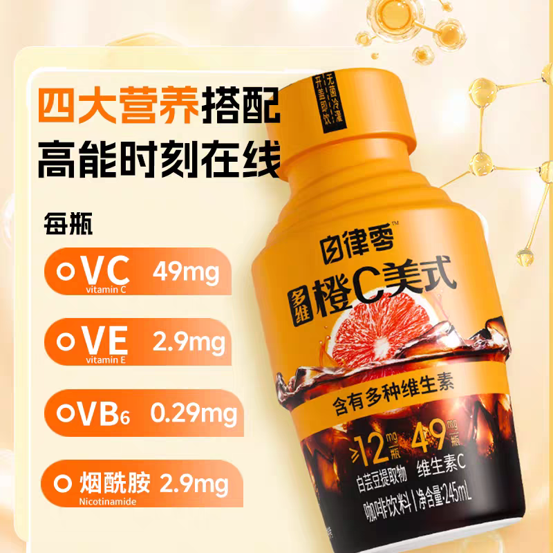 其二是果咖风味的创新同样值得关注。随着现制咖啡店生椰拿铁、橙C美式等产品的爆火,即饮咖啡品牌也迅速跟进。例如轻上推出多维橙C美式,为消费者提供了现制果咖的“平替”选择。