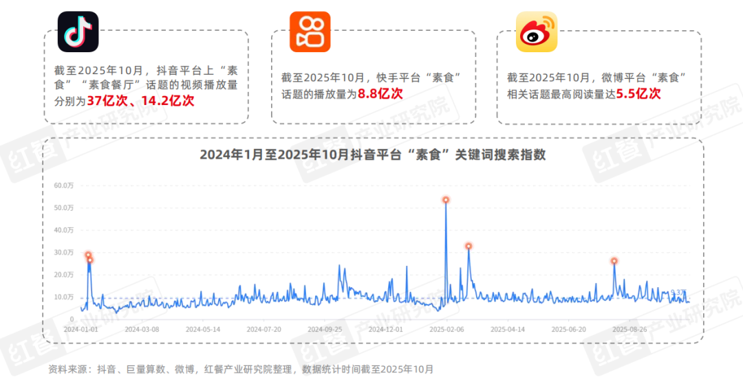 除了抖音平台外,素食相关话题在其他媒体平台的热度也居高不下。截至2025年10月,快手平台上“素食”话题播放量累计达8.8亿次;微博平台上“素食”相关话题最高阅读量达5.5亿次。