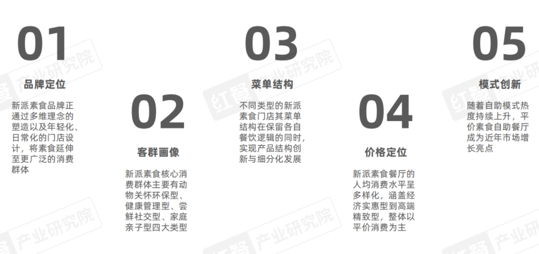 新派素食品牌在品牌定位、客群画像、菜单结构、价格定位、模式创新上均呈现出显著特征。整体来看,新派素食品牌正在通过多维创新,逐步打破小众圈层限制,向主流消费市场渗透。