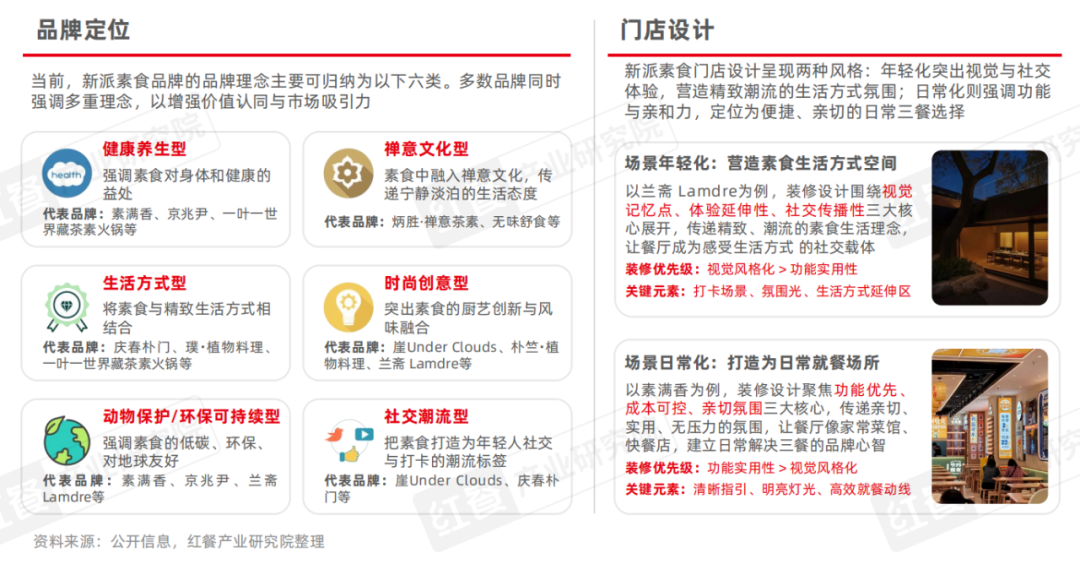 总体上看,与传统素食品牌相比,新派素食品牌在理念上更突出健康、生活方式与美学属性,通过现代化空间设计、社交媒体传播以及贴合都市生活的消费场景,逐渐吸引年轻消费人群并淡化宗教色彩。本报告将以新派素食品牌作为主要研究对象。