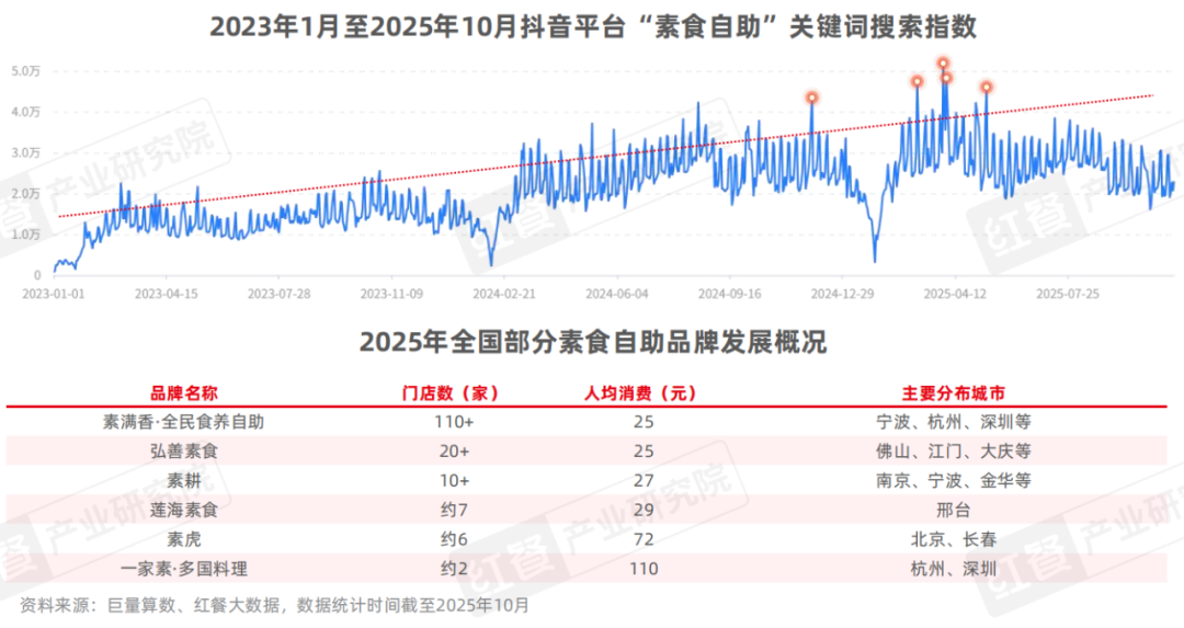 近年来,随着自助模式越来越受到市场青睐,素食自助也逐渐成了大众关注的素食细分赛道。据巨量算数,从2023年1月至2025年10月,抖音平台“素食自助”搜索热度整体呈上升趋势。