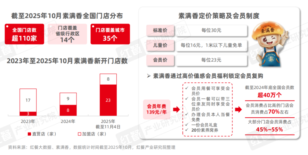 定价方面,素满香通过标准价、儿童价和会员价锁定不同消费人群。值得注意的是,凭借这种清晰的价格分级和高价值会员福利体系,如今素满香不仅沉淀出超过40万的会员规模,还有效地提升门店复购率,也为持续扩张提供了稳定客群。