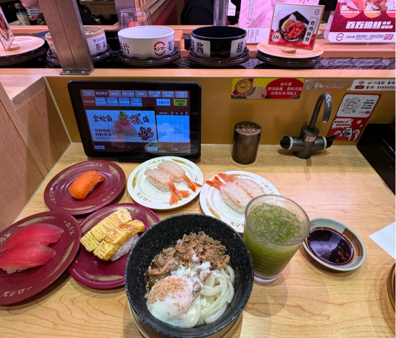 寿司郎的每个餐盘都内置了IC芯片,使用人工智能分析热门菜品,并据此订购食材,减少浪费 / 图源博主@好吃的土豆(已获取授权)