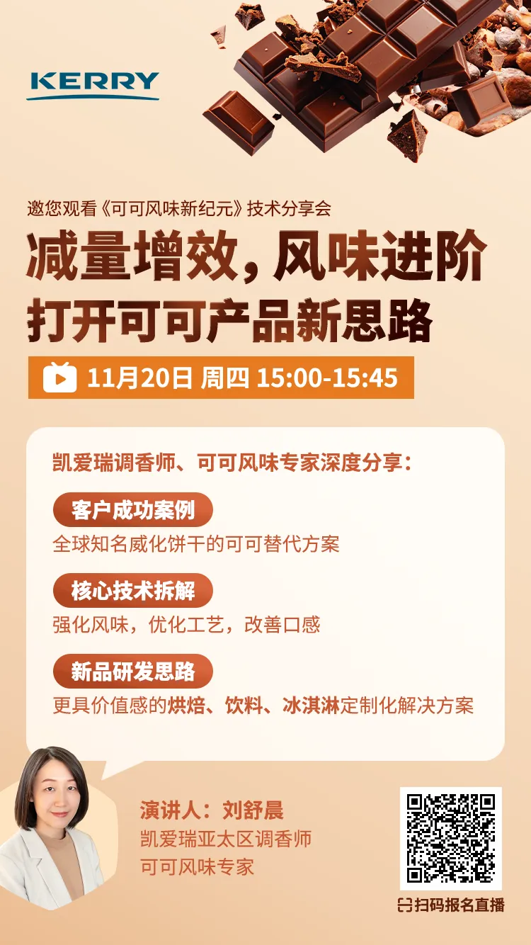 11月20日周四下午15:00,凯爱瑞亚太区调香师、资深可可风味专家刘舒晨将通过直播的方式,向广大客户和行业伙伴介绍凯爱瑞的可可风味提升技术产品、应用方案和终端产品案例。