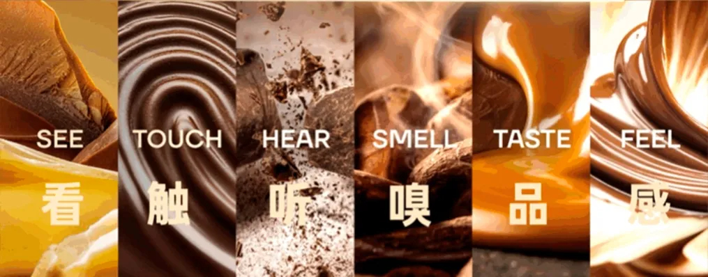 六步巧克力品鉴法则是通过调动品鉴者的视觉、触觉、听觉、嗅觉、味觉以及综合感知力,帮助品牌实现对巧克力从外观观察到内在感受、从风味感知到情绪共鸣的全方位体验。