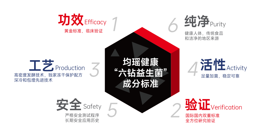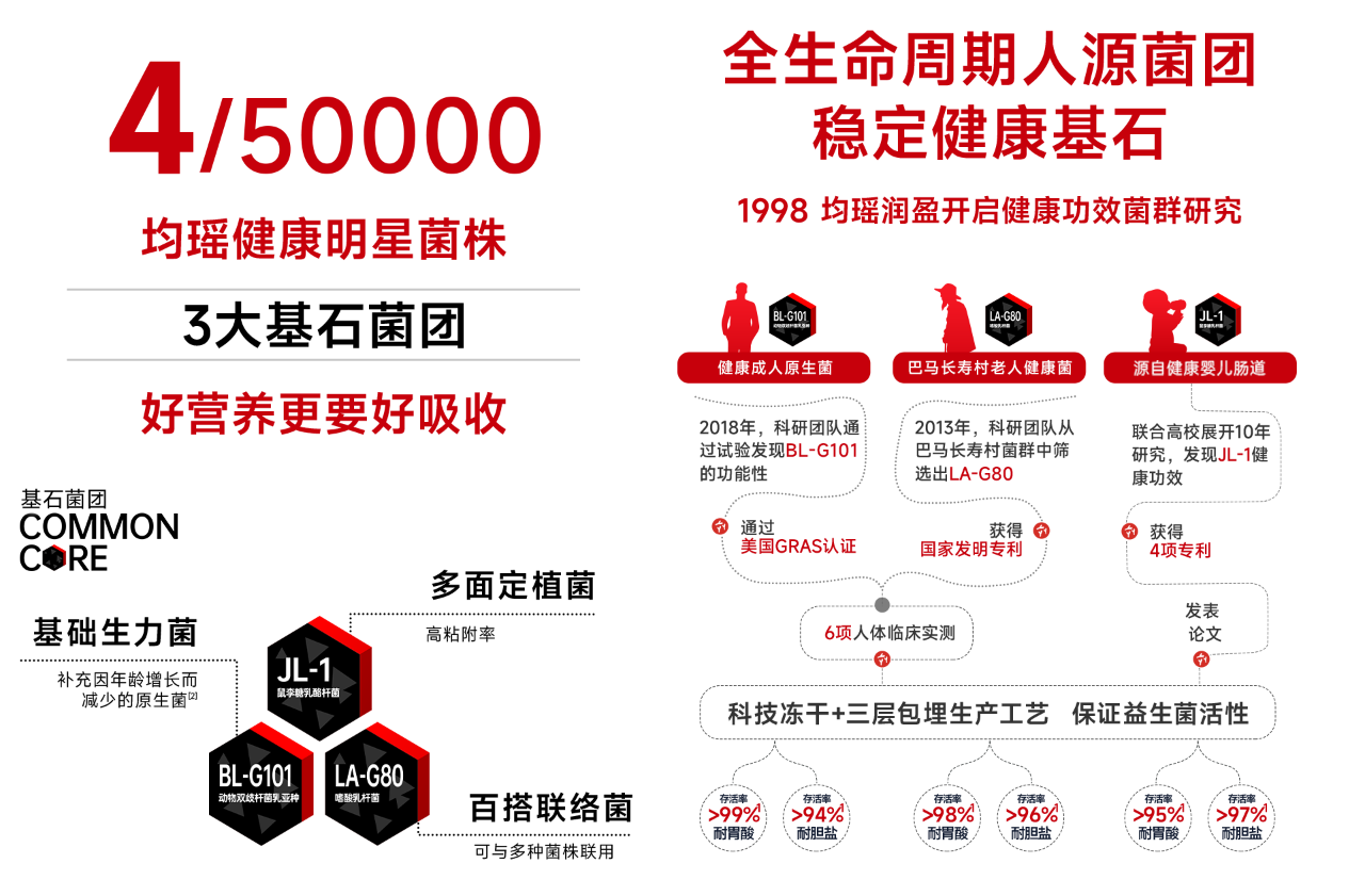 为将这一洞察转化为产品力,均瑶健康大力加码研发,近两年研发投入增速高达38%(数据来源:均瑶健康财报),将益生菌推向产业创新的核心。企业正致力于将益生菌从泛泛的“健康概念”升级为如同芯片一般的“功效内核”,使其成为驱动产品差异化的硬核科技。均瑶健康提出了全新理念下的益生菌选菌标准——科学选菌「六钻」标准。将复杂的选菌流程转译为六大可量化标准,又从50000+菌株库中优选出基石菌团。