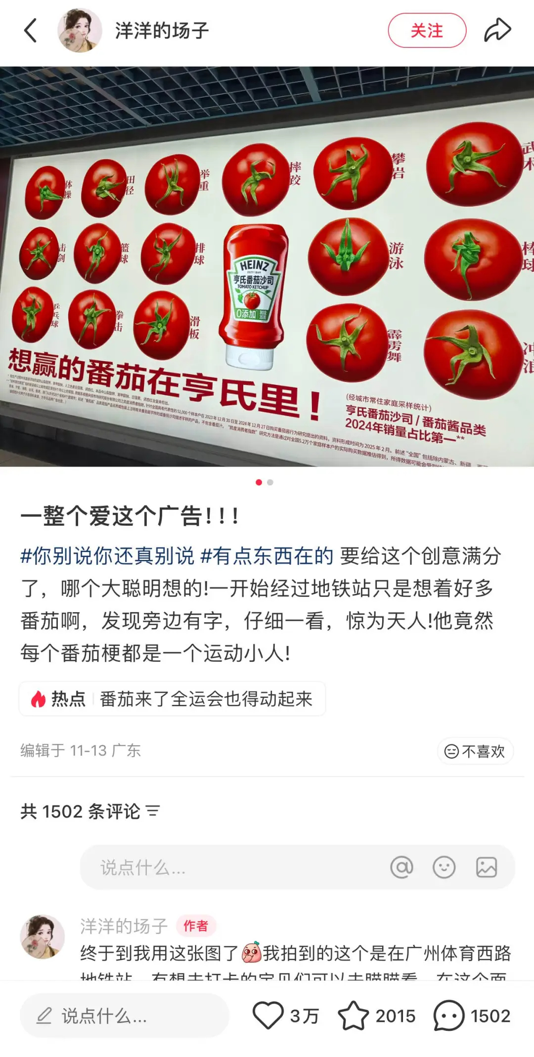 好在,最终用户给出了高分好评:10w+浏览的UGC内容、自发形成的小红书 hashtag#亨氏运动会、“对我的眼睛很好”“真正的广告”“4A广告回来了”等铺天盖地的好评……瞬间爆发的社媒热度就是证据。