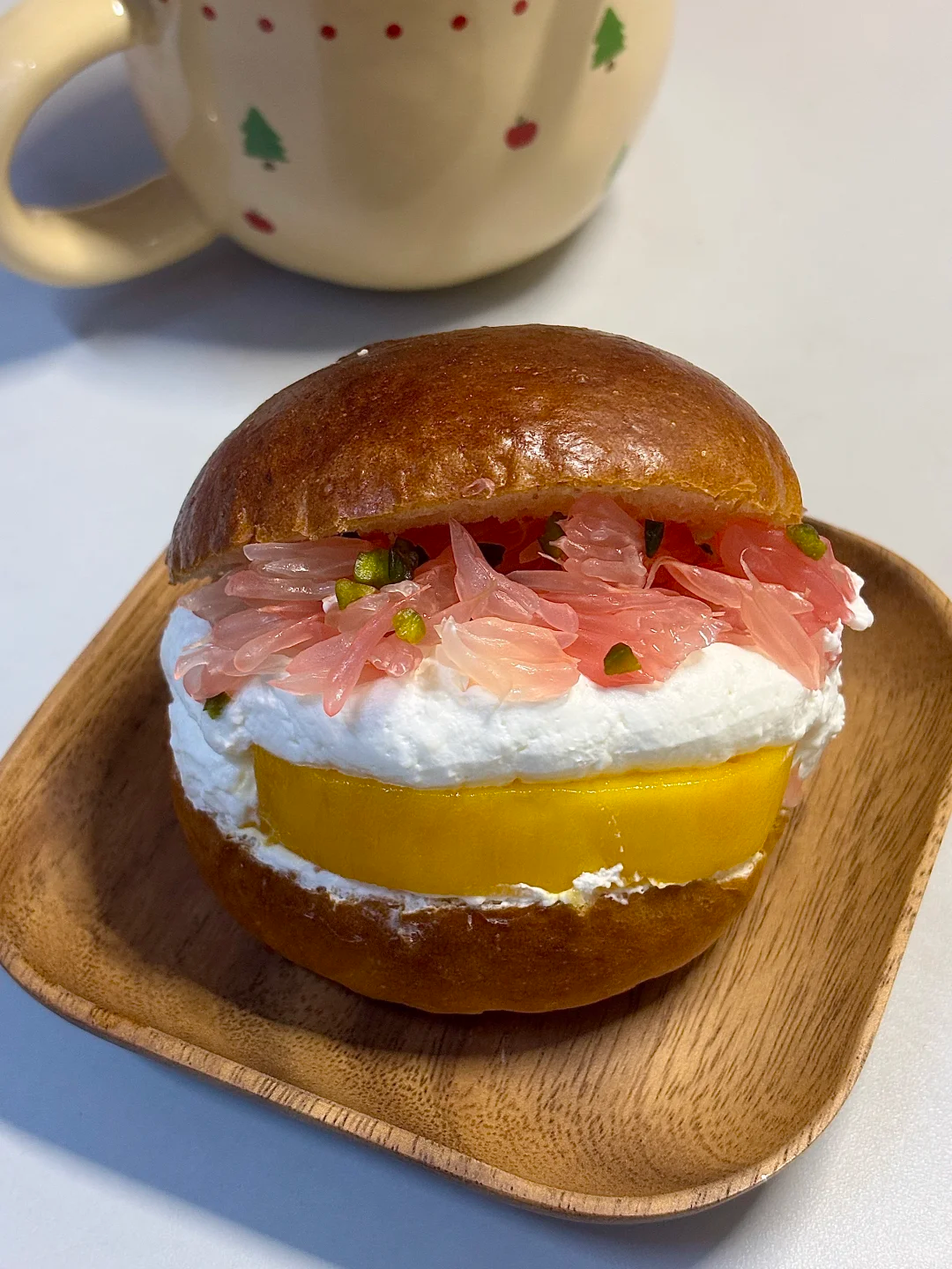 比如杨枝甘露,从杯中走到面包里,成了芒果泥+西米+椰奶酱的甜点新组合。你以为在吃面包,其实是喝了一口“实心版杨枝甘露”。