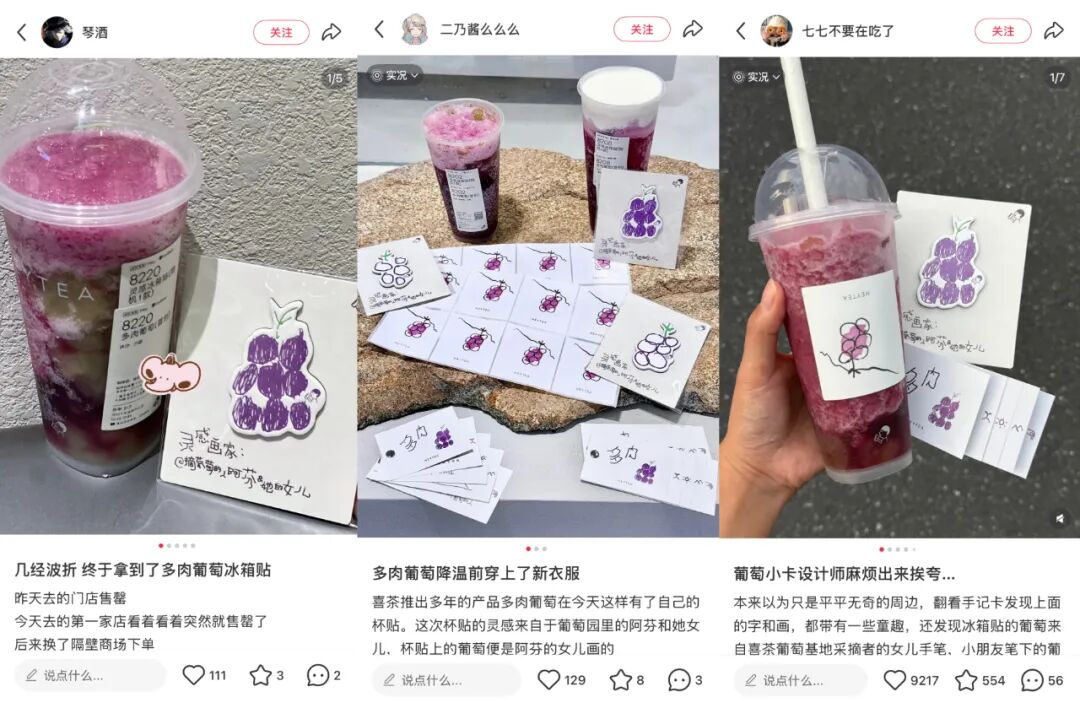 相关杯贴、冰箱贴一经上市,就遭到疯抢,不少门店在上市当天下午便宣告售罄。社交平台上满是求货的声音,市场对素人创作的买单,不仅让喜茶摸清了用户偏好,也为后续的用户共创埋下了伏笔。