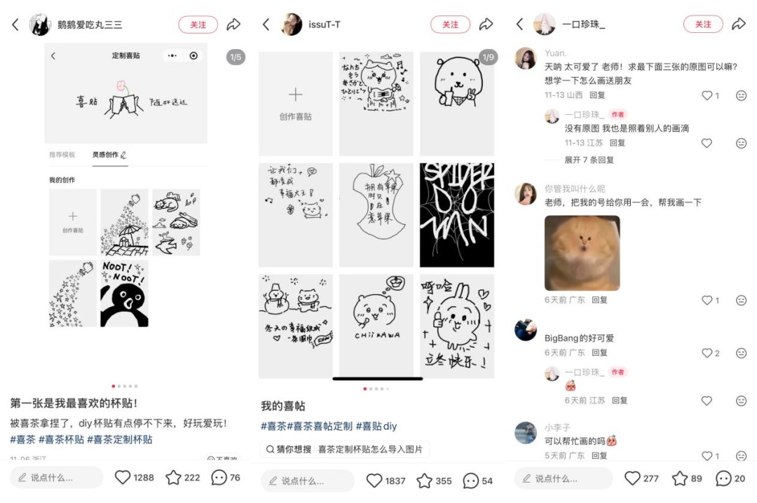 截至目前,#喜茶喜贴、#喜茶定制杯贴 等相关话题在社交平台累计浏览量已飙破2000万。社交平台上还衍生出代画、绘图教程、闲鱼“喜贴定制”等野生业务,形成了喜贴喝奶茶,晒喜贴再种草的闭环。