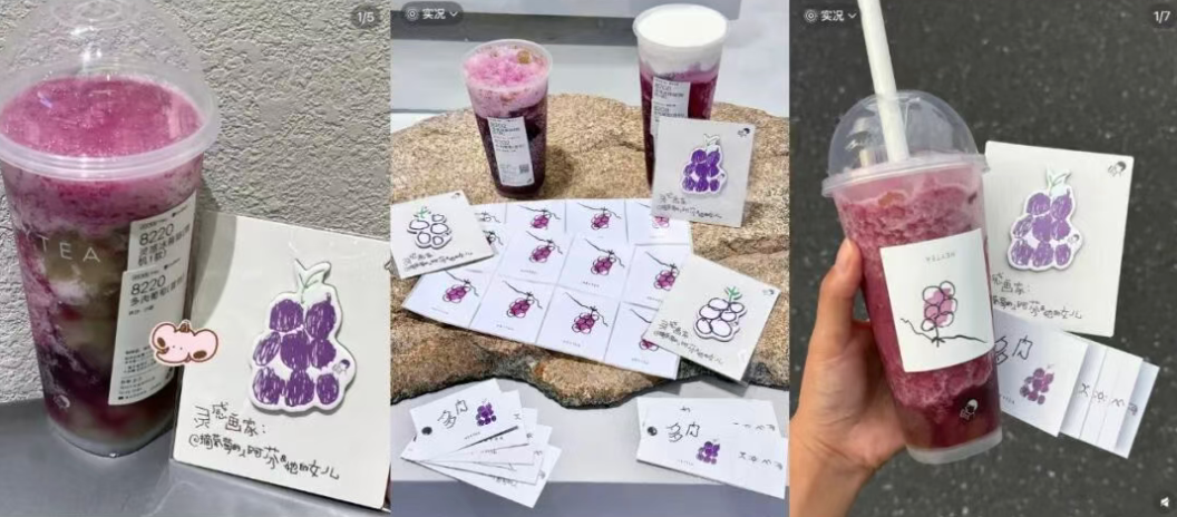 早在这场狂欢前,喜茶就已经悄悄“试水”。今年10月,喜茶将云南建水的果园女工阿芬5岁女儿画的葡萄涂鸦,原封不动搬上了多肉葡萄的杯贴、冰箱贴。