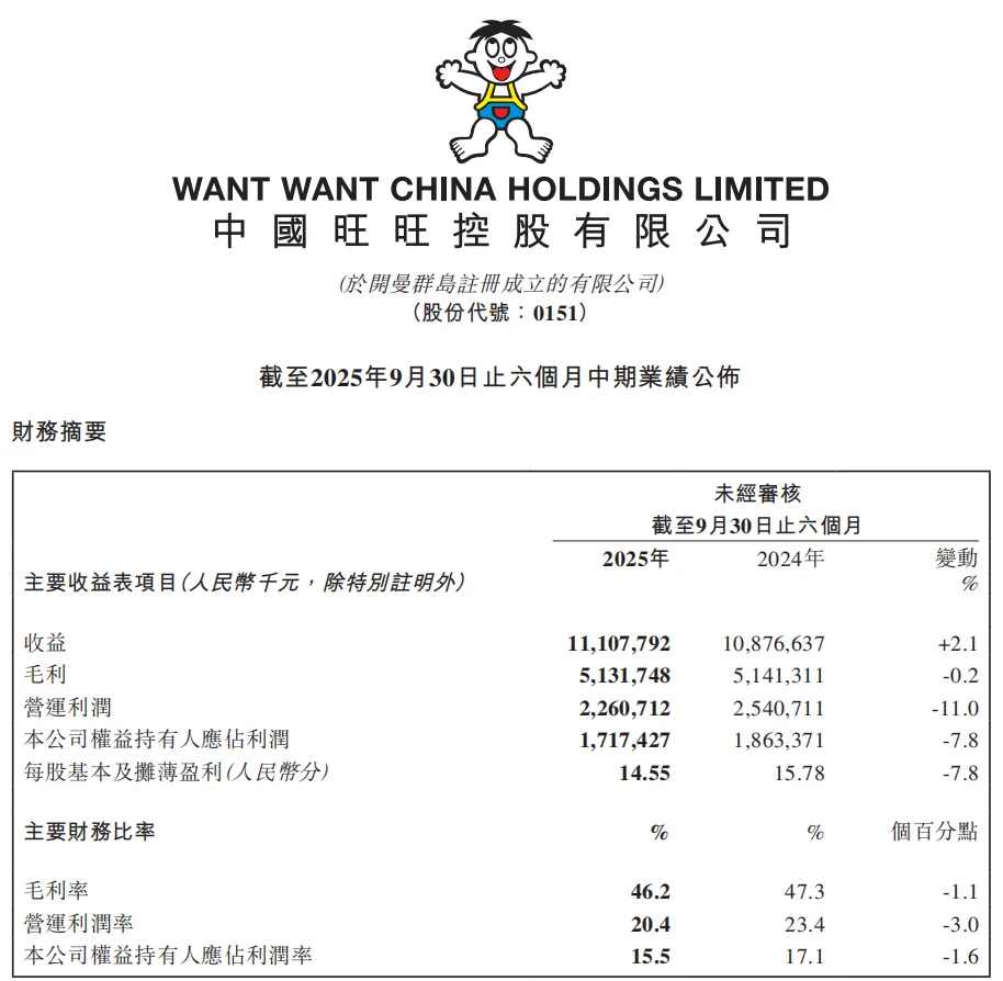 6、上半年总收益达111.08亿元!中国旺旺发布2025年中期财报
