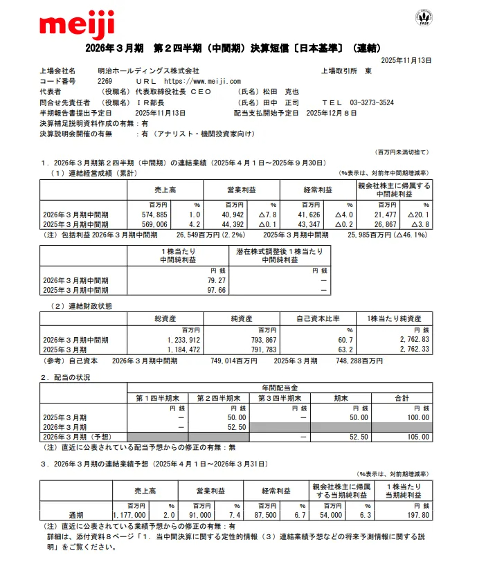 7、销售额达260亿元!明治控股发布2026财年中期财报
