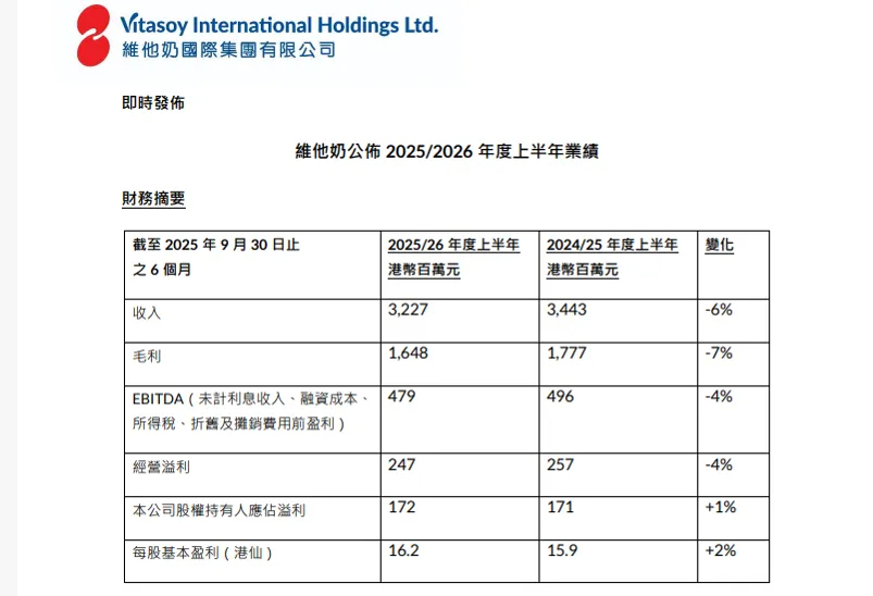 11月25日,维他奶国际发布截至2025年9月30日止六个月的业绩公告。公司在中期财务期间录得收入为32.27亿港元(折合人民币约29.4亿元),较去年同期减少6%。毛利为16.48亿港元(折合人民币约15亿元),下降7%,毛利率轻微下跌至51.1%。收入减少主要由于中国内地业务受市况疲弱影响,面临挑战。