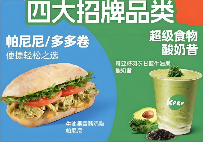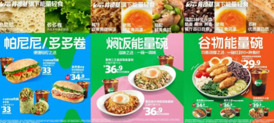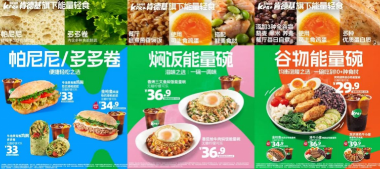 现有的菜单设置也能看出,KPRO一改满是炸鸡可乐等垃圾食品的标签,而是增添了很多轻食元素:既有传统轻食沙拉、酸奶、能量碗等菜品,也有帕尼尼具有“肯德基”特色的轻食选择。