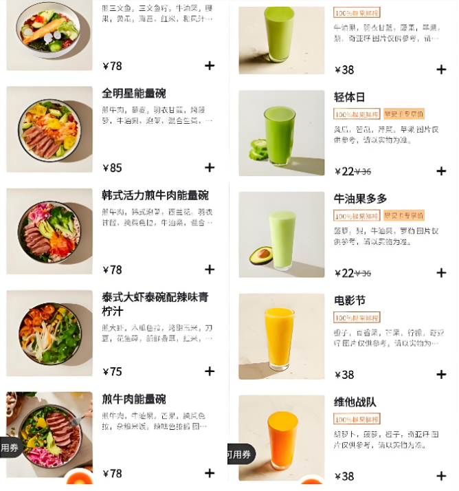 其中,单杯超级食物酸奶昔菜单价25元,部分套餐可以6元换购;一份三文鱼或牛肉焖饭能量碗,搭配一杯无糖柠檬可乐,售价36.9元;一份嫩烤鸡胸肉荞麦面碗搭配无糖柠檬可乐,售价为29.9元。