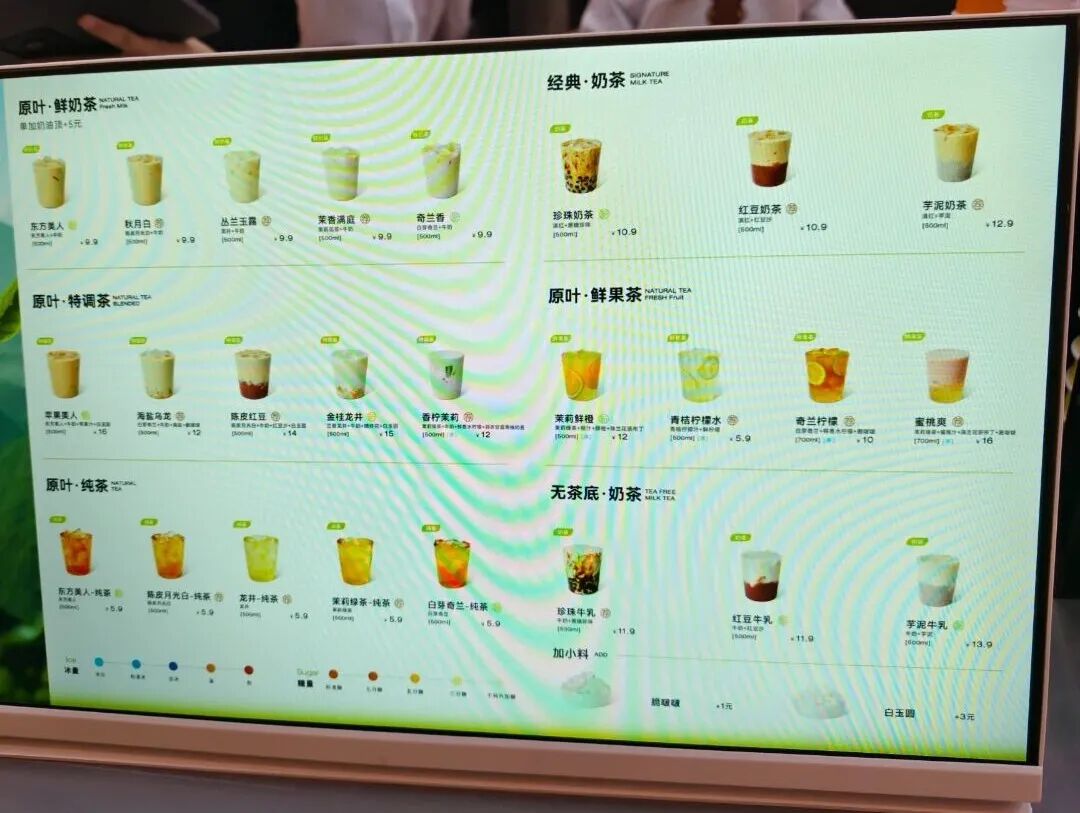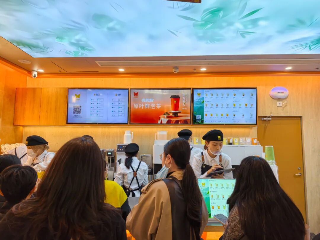 开业当天中午,联商网实地探访发现,大悦城店门口排起了长队,平均取号等待时间15-20分钟。49㎡的门店配置了5名员工,设有堂食区,主打原叶鲜奶茶、原叶鲜果茶等六大系列产品,价格从5.9元到16元不等。一位在现场排队的顾客向联商网表示:“从小喝到大的品牌,就想看看它开的茶饮店怎么样。”