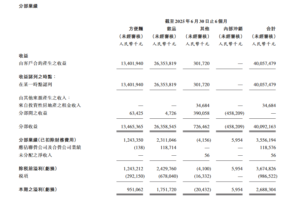 从财报数据来看,2025年上半年统一总营收约170.87 亿元,同比增长10.6%,净利润为12.87亿元,同比上升33.2%。其中饮品业务录得107.88亿元的收益,占总营收的63.1%,同比增长7.6%,是拉动集团增长的首要引擎。