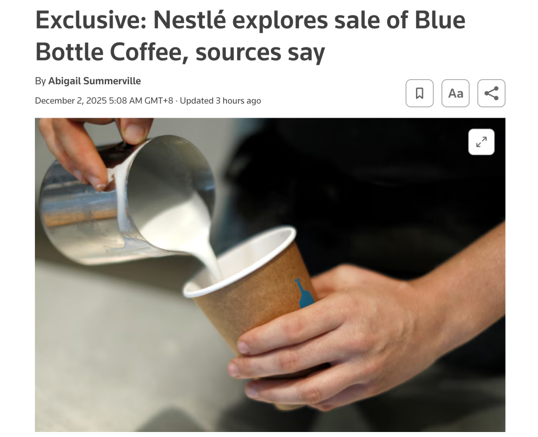 12月2日最新传来的消息,是这家全球最大的食品公司被指正考虑出售蓝瓶咖啡(Blue Bottle Coffee)。据今天路透引述“三位知情人士”透露,雀巢正与投资银行摩根士丹利合作,实施本次评估。