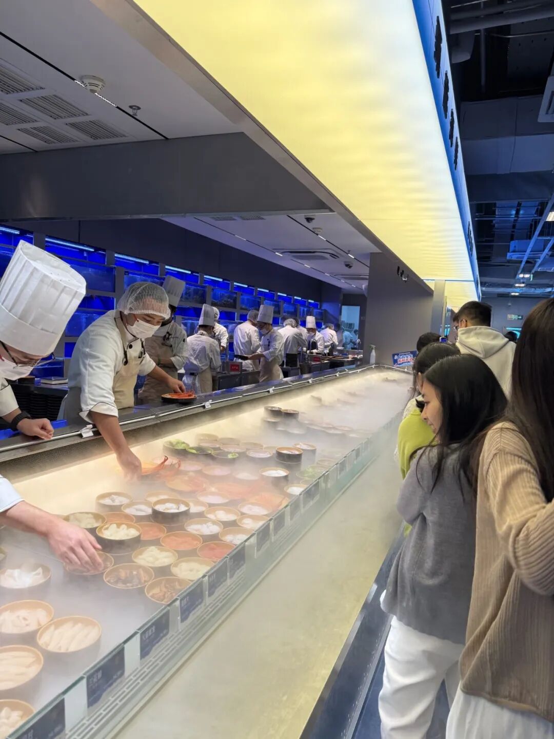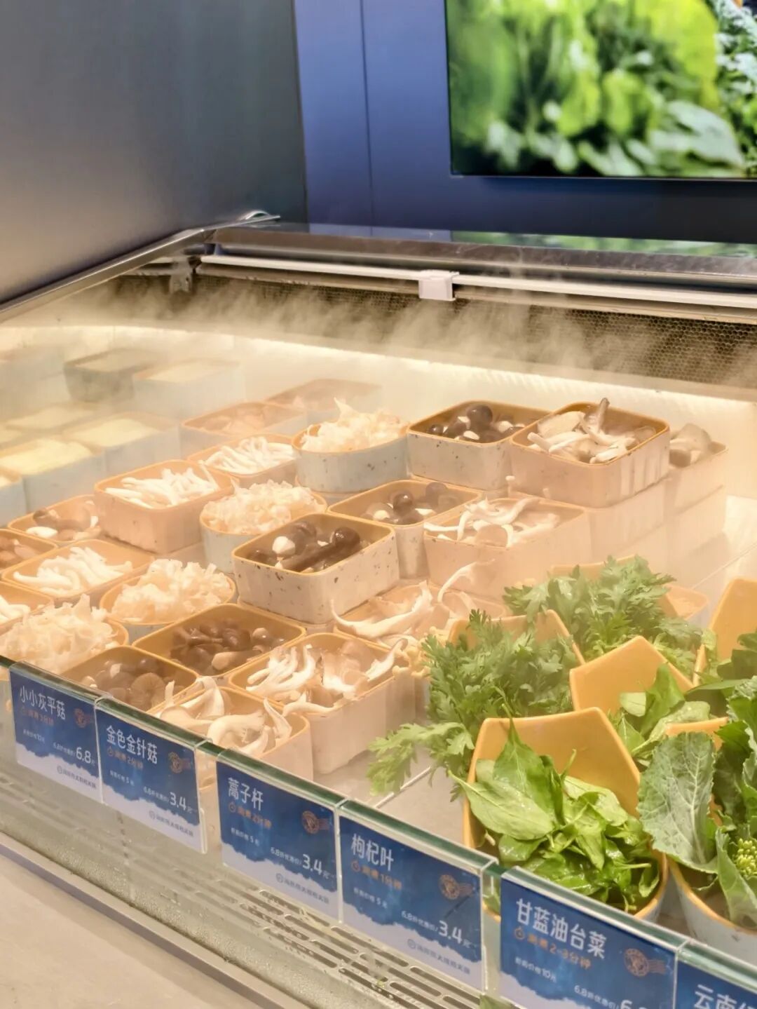 本次,海底捞打破了传统火锅店点菜、上菜的服务模式。门店内设置了鲜切区、海鲜区、铁板区、水果饮品区等开放式档口,产品如市集摊位般分区呈现。顾客穿行其间,自主挑选食材,现场观看加工过程,让顾客看到新鲜。