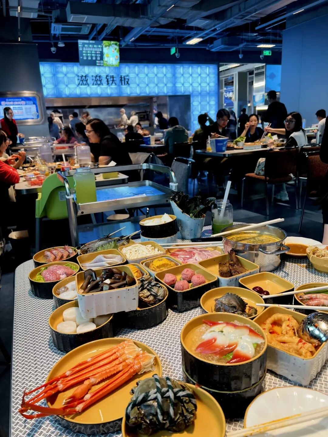 在产品设置方面,200多款产品“多而不杂”,鲜切肉类、鲜活海鲜和铁板系列结合充满烟火气和市井感的现场加工,同时,门店的产品会随着时令动态调整,让顾客“常吃常新”。