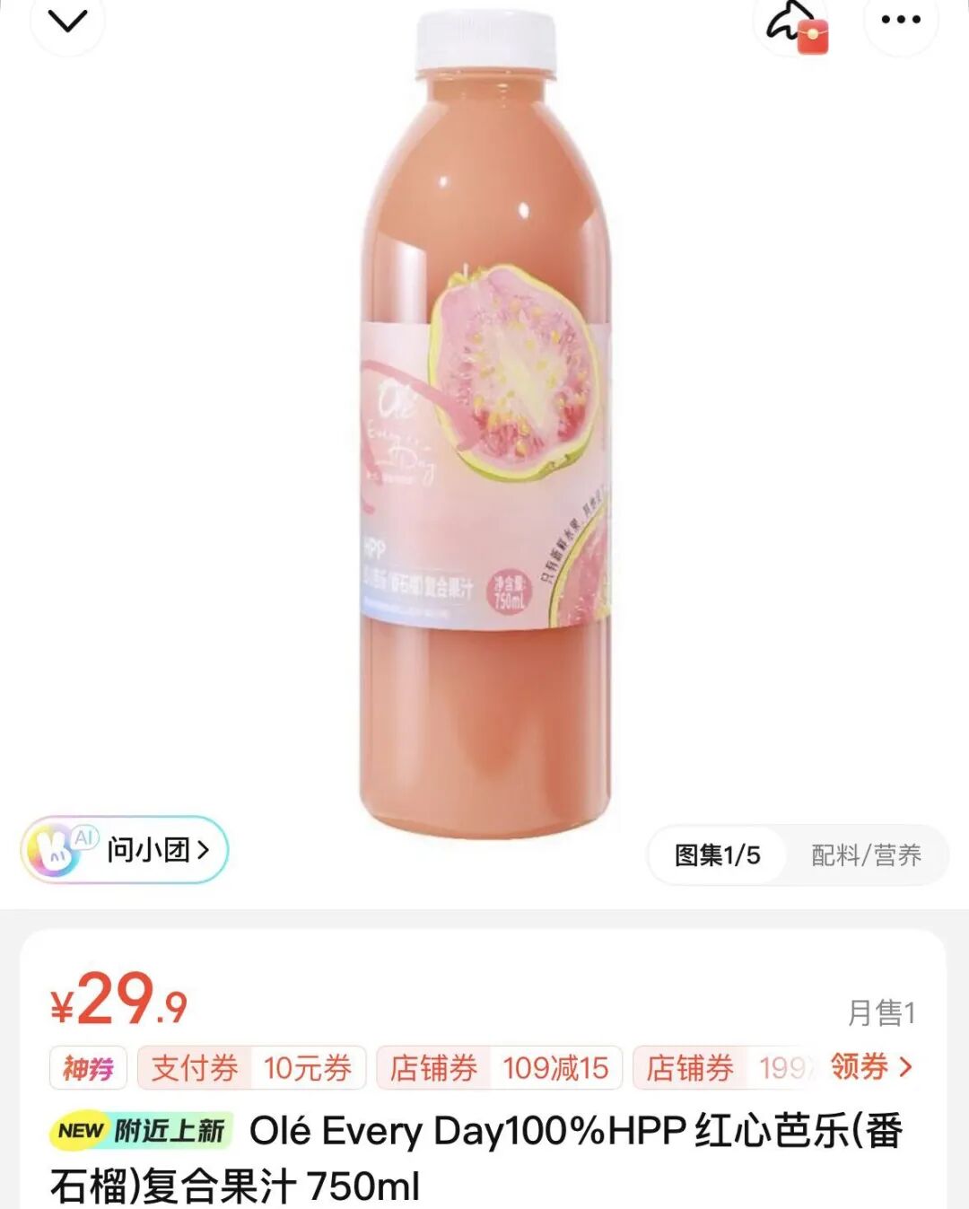 盒马的HPP红心苹果汁更是在2024年销售额同比激增400%;山姆上架了采用HPP工艺的羽衣甘蓝复合果蔬汁,月销突破20万件;朴朴超市1L装100%HPP羽衣甘蓝汁,成为平台销量增长最快的品类之一;ole精品超市、小象超市货架上的HPP果汁也越来越多...