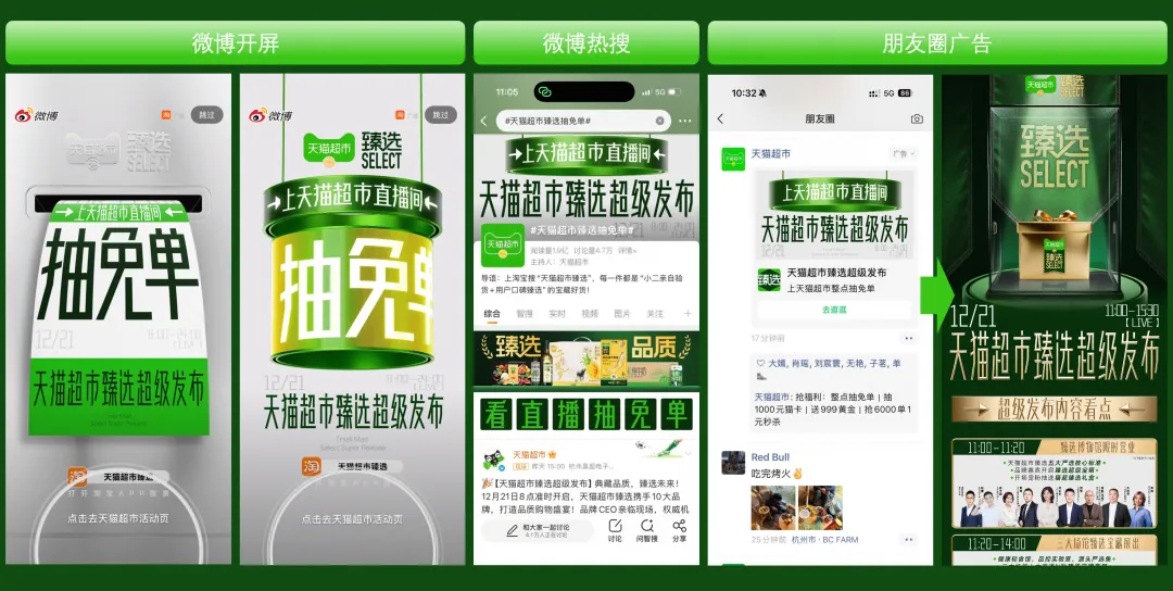 在站外,天猫超市通过#天猫超市臻选抽免单#微博热搜、APP开屏、朋友圈广告等媒介位点进一步“广而告之”,引爆天猫超市臻选发布话题度,扩大触达人群的广度。