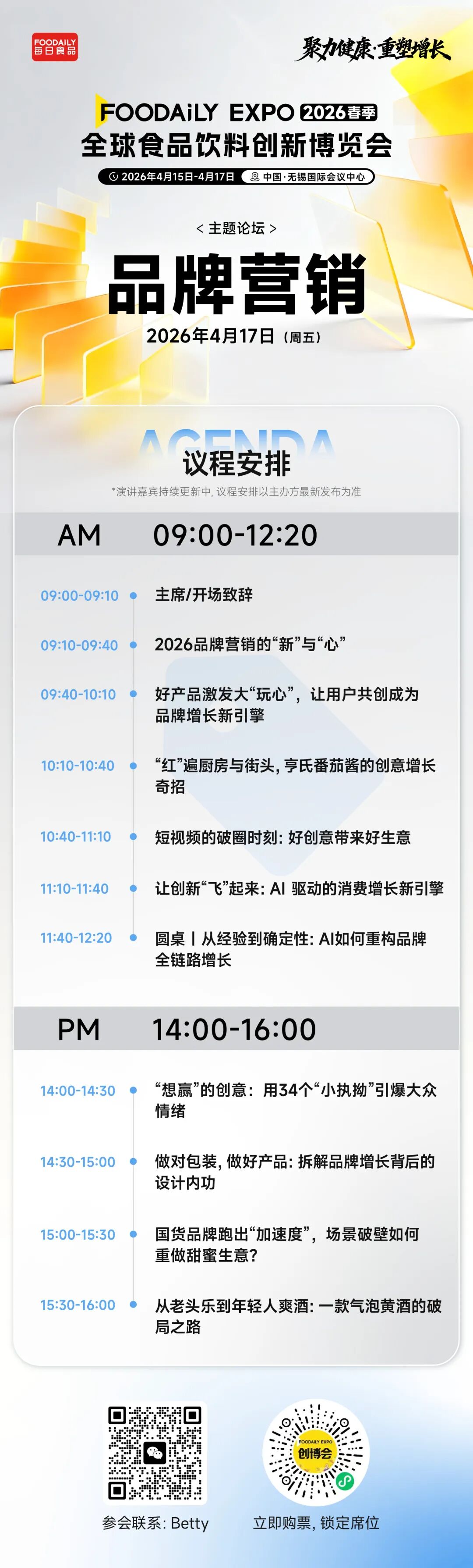 为了深入探讨这些关乎未来的命题,以「聚力健康 · 重塑增长」为主题的2026 Foodaily全球食品饮料创新博览会,将于2026年4月15日至17日在中国·无锡国际会议中心举行。我们特别策划推出「品牌营销」主题论坛,旨在汇聚行业智慧,共同探寻增长的本质与路径。