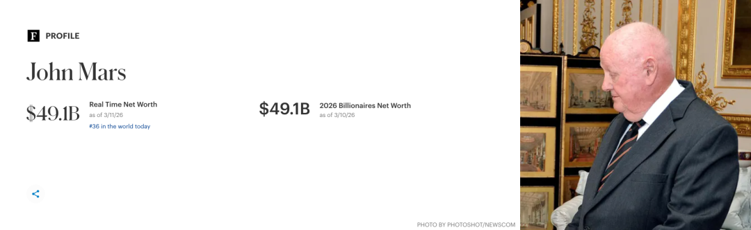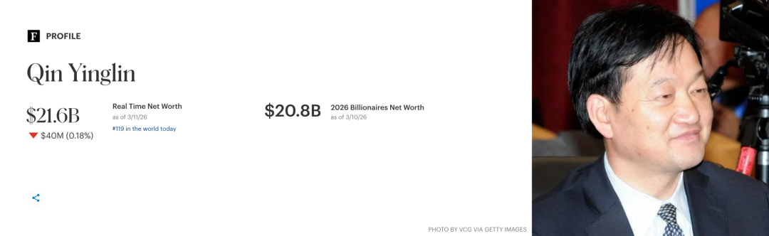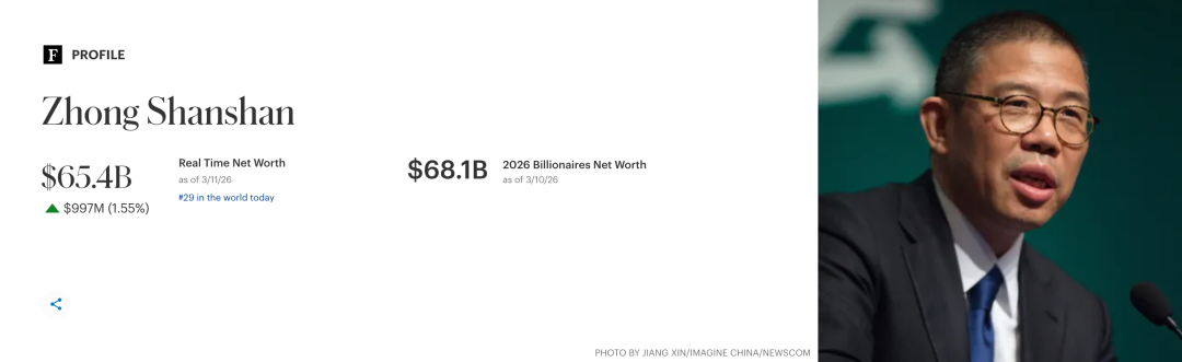 钟睒睒位居全球亿万富豪榜第29位、食品饮料相关领域榜单首位,净资产为681亿美元(约合人民币4676亿元),较2025年的577亿美元有所增长。福布斯指出,其财富来源为农夫山泉以及万泰生物。钟睒睒是农夫山泉的创始人兼董事长,该公司于2020年在香港上市,目前为中国本土最大的饮料公司。钟睒睒的财富还来自于对万泰生物的实际控制,后者于2020年在上交所上市,从事生物诊断试剂与疫苗研发及生产。