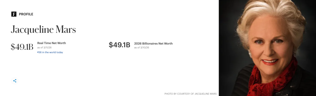 紧随钟睒睒之后的是玛氏家族的两位成员:90岁的John Mars和86岁的Jacqueline Mars,净资产均达到491亿美元(约合人民币3371亿元),并列食品饮料领域第二位。年销售额达650亿美元的玛氏由两人的祖父Frank C. Mars于1911年创立。作为第三代成员的John、Jacqueline和Forrest Mars Jr.(2016年去世后,其股份由四个女儿继承)各持有玛氏三分之一的股份。