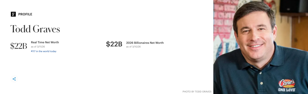 美国快餐界也有代表上榜:Raising Cane's创始人Todd Graves,净资产达到220亿美元(约合人民币1511亿元)。这个专注于售卖炸鸡柳、波纹薯条等的快餐品牌于1996年成立,如今它已发展成为一家年销售额达51亿美元的公司,在美国42个州约有900家门店。