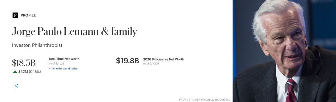 紧随其后的是Jorge Paulo Lemann及其家族,净资产达到198亿美元(约合人民币1360亿元)。今年86岁的Lemann是私募股权公司3G Capital的联合创始人兼合伙人,该公司以投资百威集团、RBI集团(Restaurant Brands International,汉堡王的母公司)而闻名。